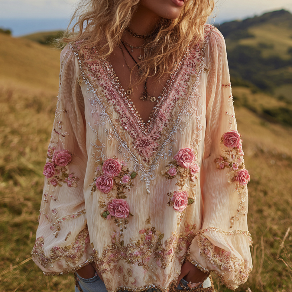 Bohème Rose Art Thin Long Sleeve V Neck Top