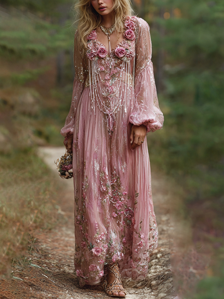 Bohemian Floral Beaded Pink V-neck Long Sleeve Dress