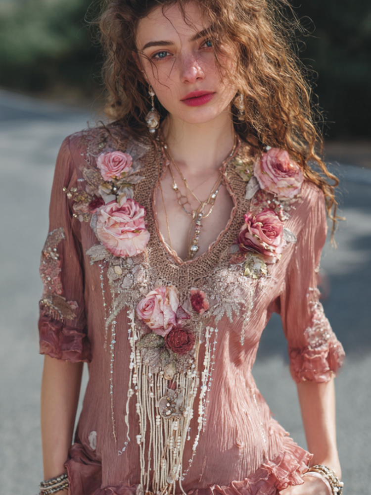 Bohemian-style Pink Floral Embroidery V-neck Short-sleeved Shirt With Sequins