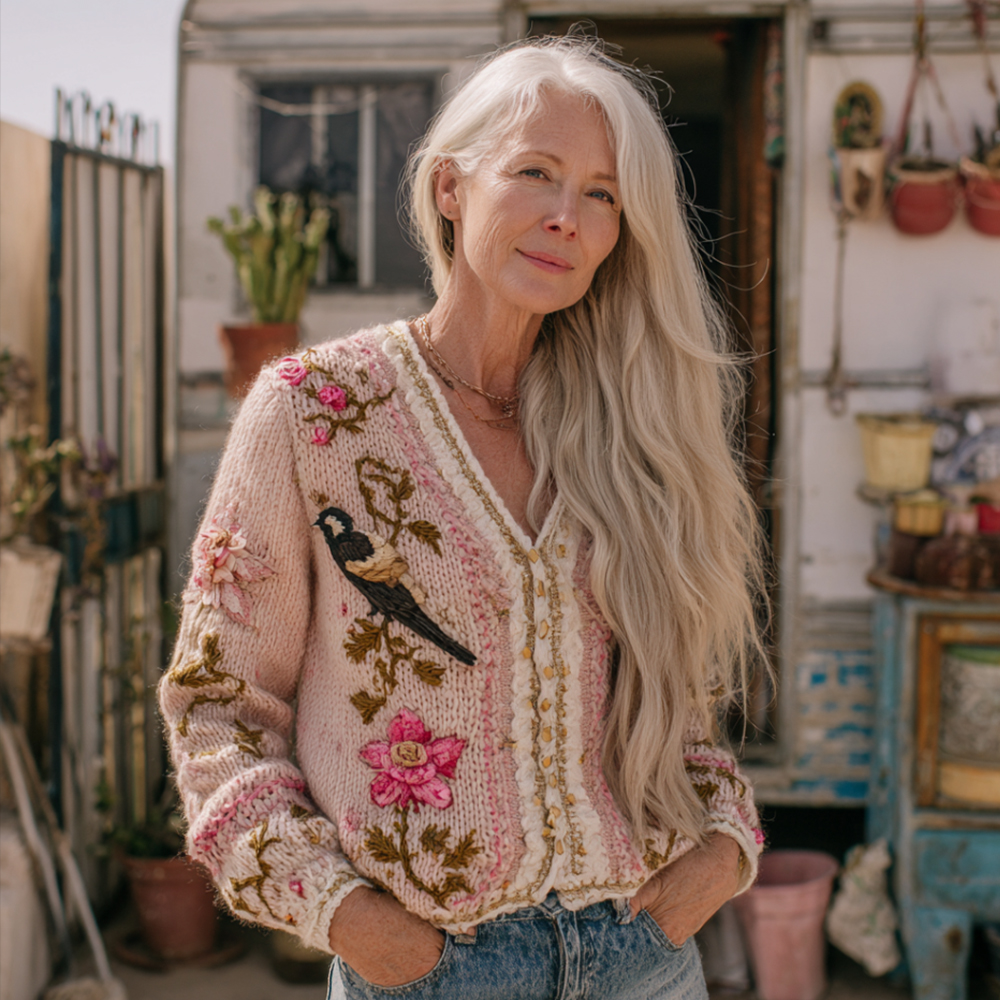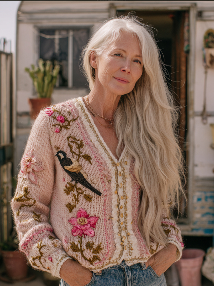 Bohemian Pink Rose Embroidered Casual V-neck Sweater