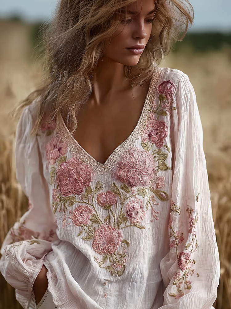Bohemian Retro Countryside Style Plant Flower Design Cotton And Linen Women’s Long-sleeve Shirt