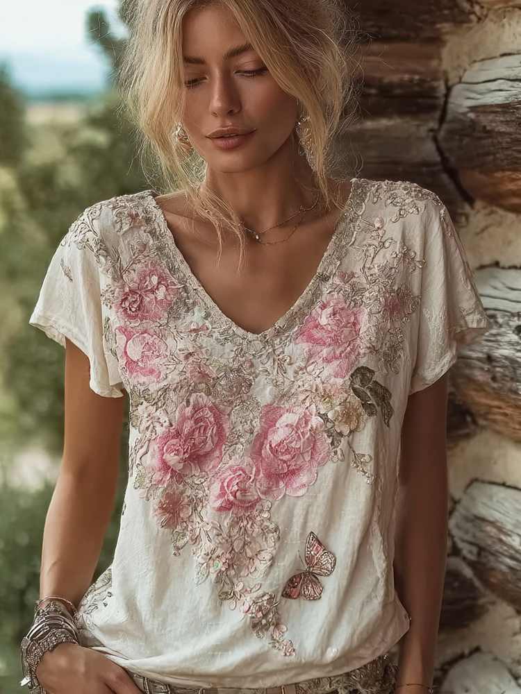 Women’s Retro Boho Pink Floral Embroidered Art V-neck Short Sleeve T-shirt