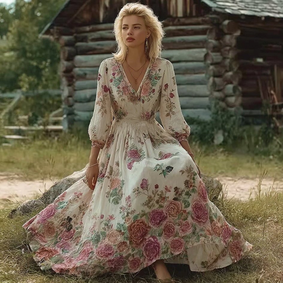 Bohemian Style Floral Butterfly Pattern Women’s V-neck Dress