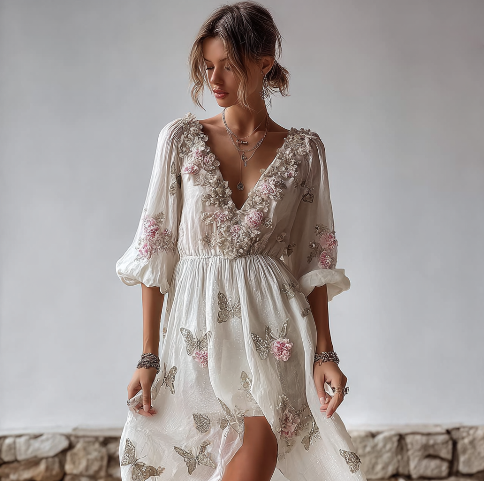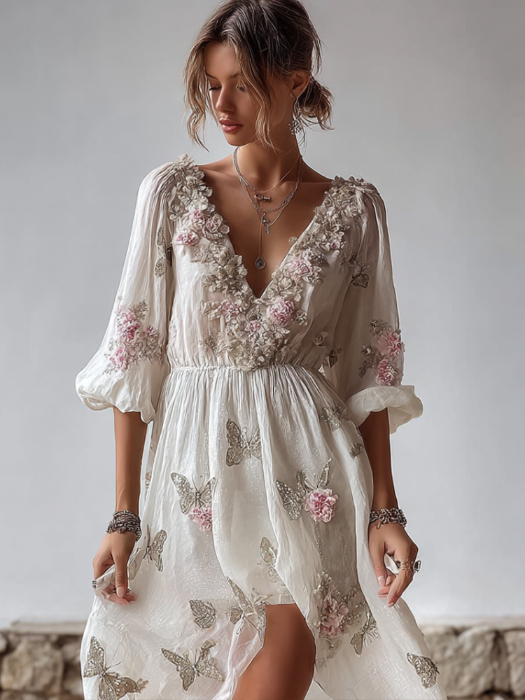 Bohemian Style Plant Flower And Butterfly Pattern Embroidery Design V-neck Woman’s Long Dress