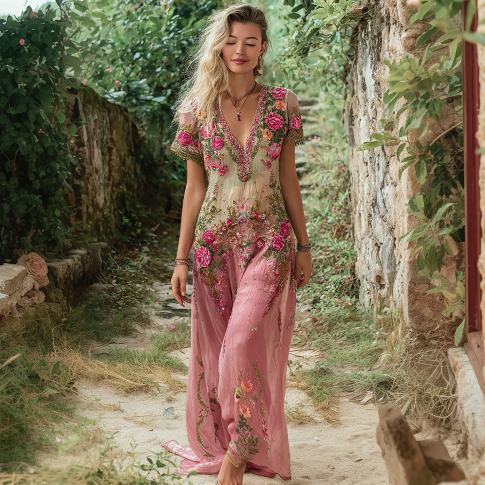 Boho Ethnic Floral Sequin Embroidery Women’s Linen V-neck Maxi Dress