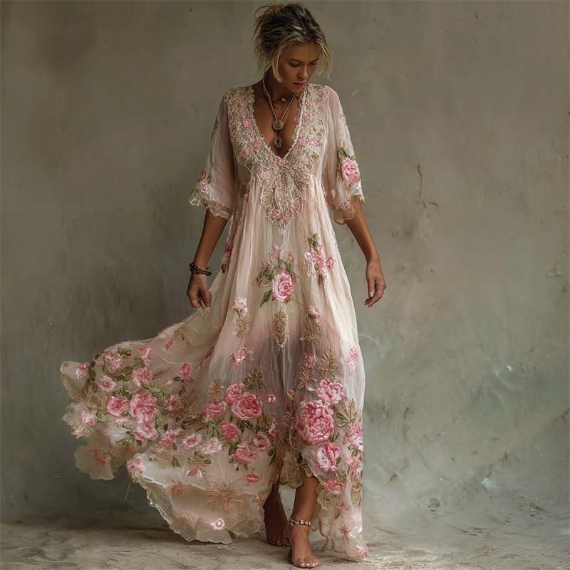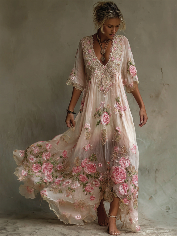 Boho Pink Roses Embroidered Lace Patchwork Linen Maxi Dress