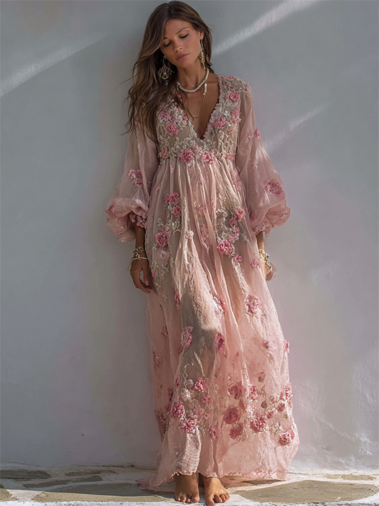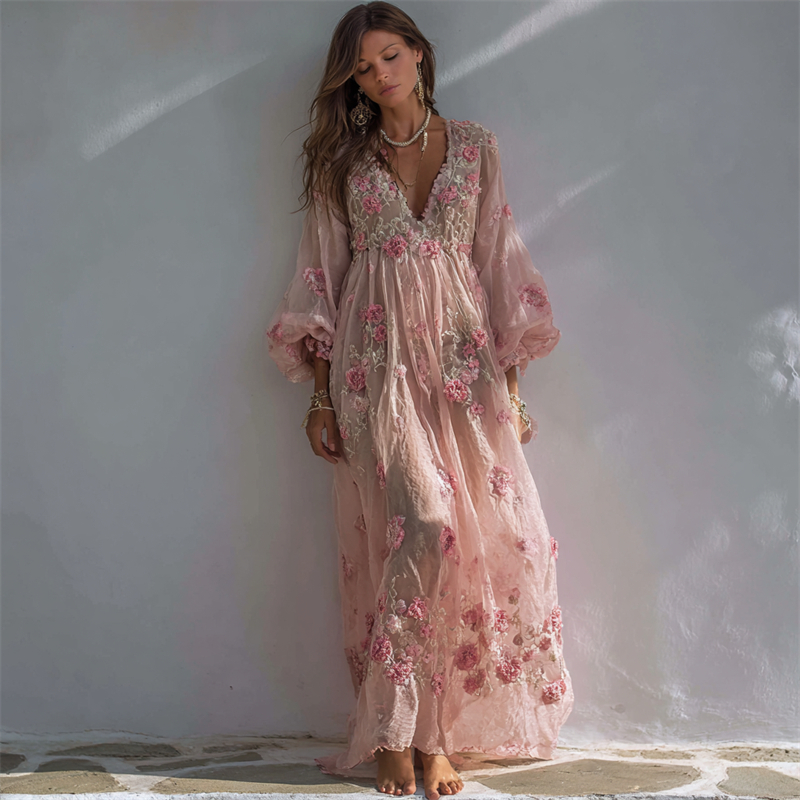 Boho Pink Roses Floral Embroidered Linen Maxi Dress