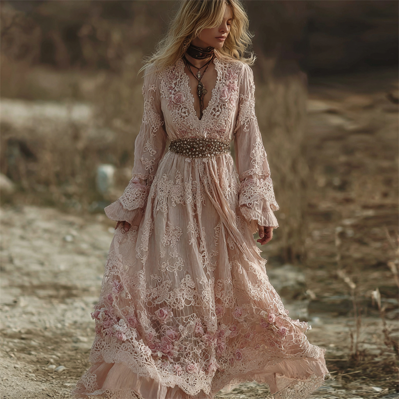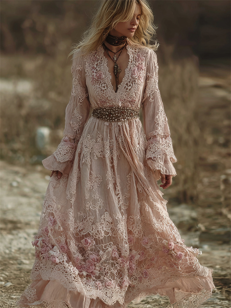 Boho Pink Roses Floral Lace Art Flowy Linen Maxi Dress