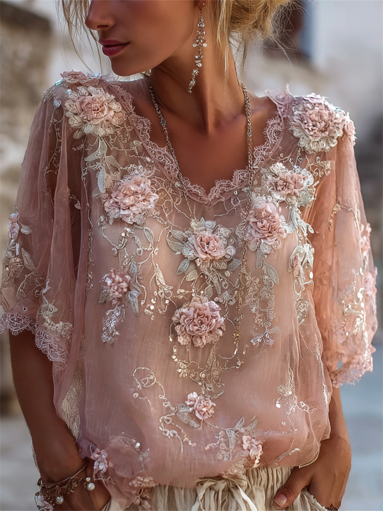 Bohemian-style Pink Floral Embroidery V-neck Short-sleeved Shirt With Sequins