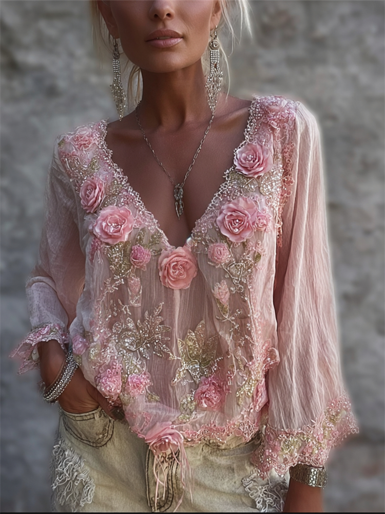 Bohemian-style Pink Floral Embroidery V-neck Short-sleeved Shirt With Sequins