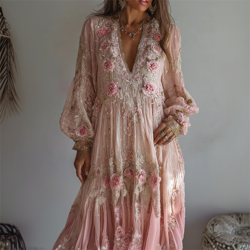 Boho Pink Roses Lace Flowy Linen Maxi Dress