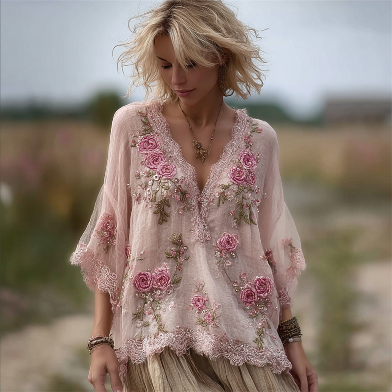 Boho Pink Roses Lace Trim Flare Flowy Linen Tunic