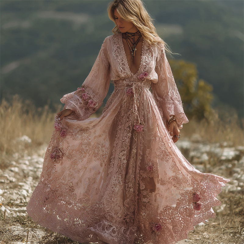 Boho Roses Floral Lace Art Flowy Linen Maxi Dress