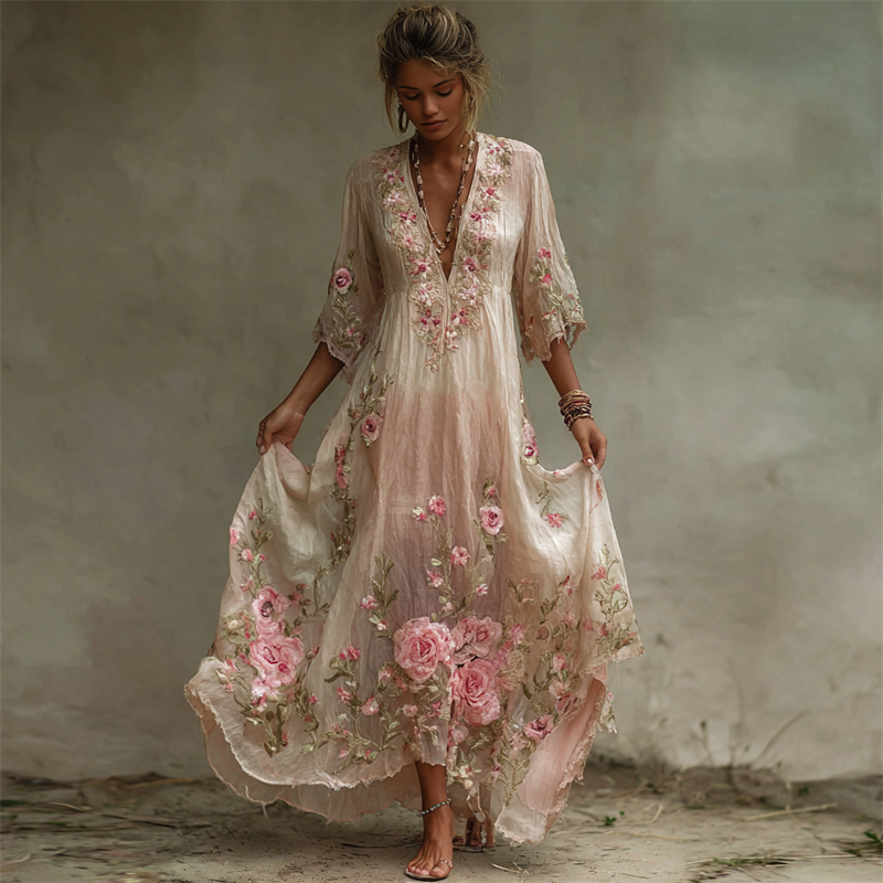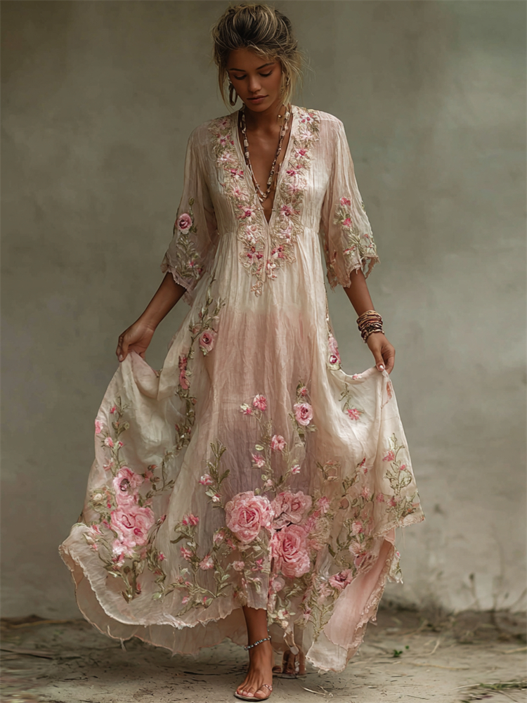 Classy Pink Roses Embroidered Flowy Linen Maxi Dress