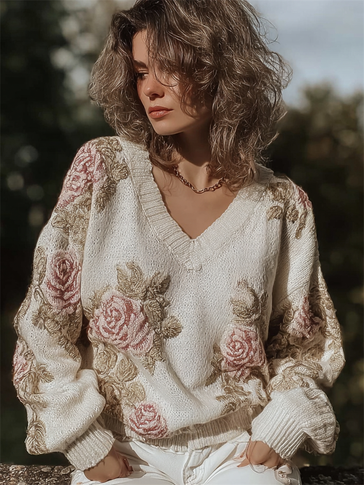 Classy Vintage Roses Glitter V Neck Cozy Knit Sweater