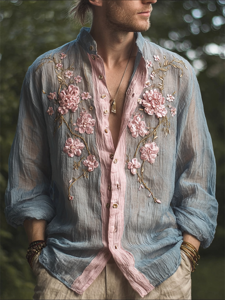 Men’s Boho Pink Floral Fiber Art Contrast Flowy Linen Shirt
