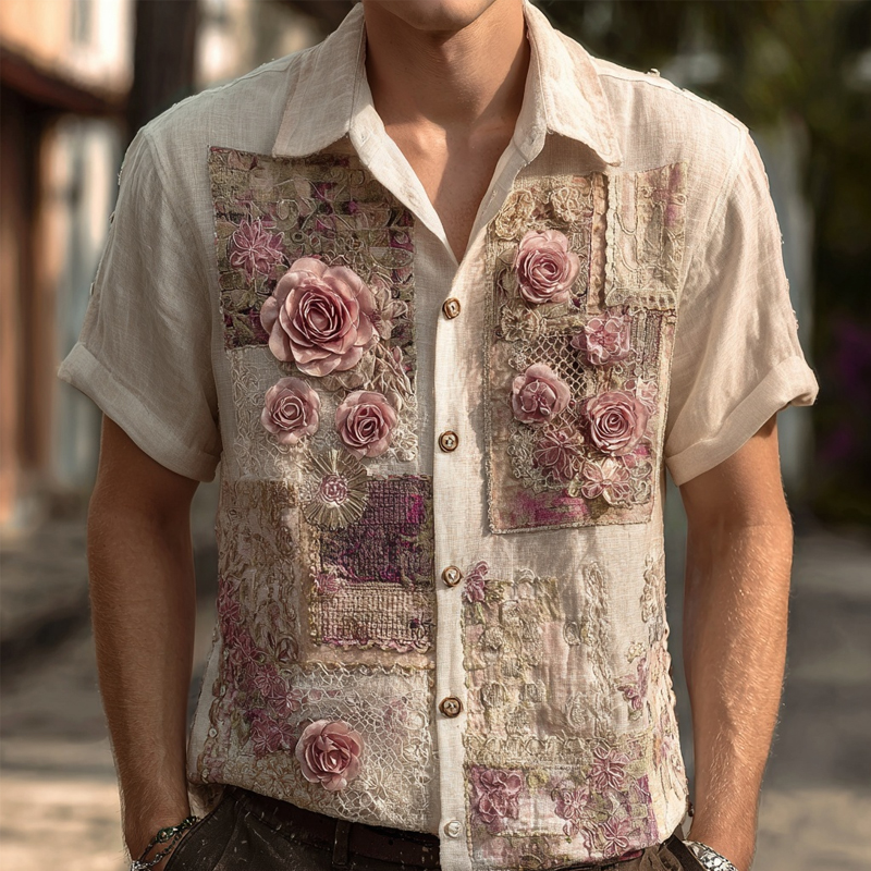 Men’s Floral Lace Embroidered Retro Patchwork Linen Shirt