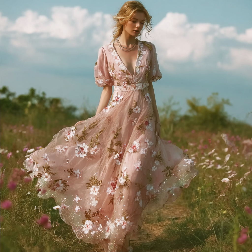 Retro Pink Rose Design V-neck Long-sleeve Casual Dress