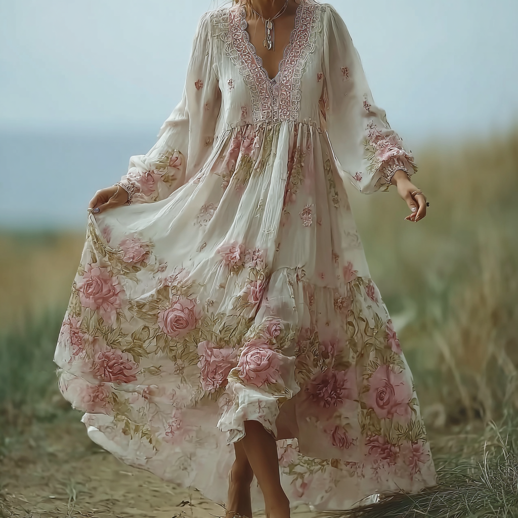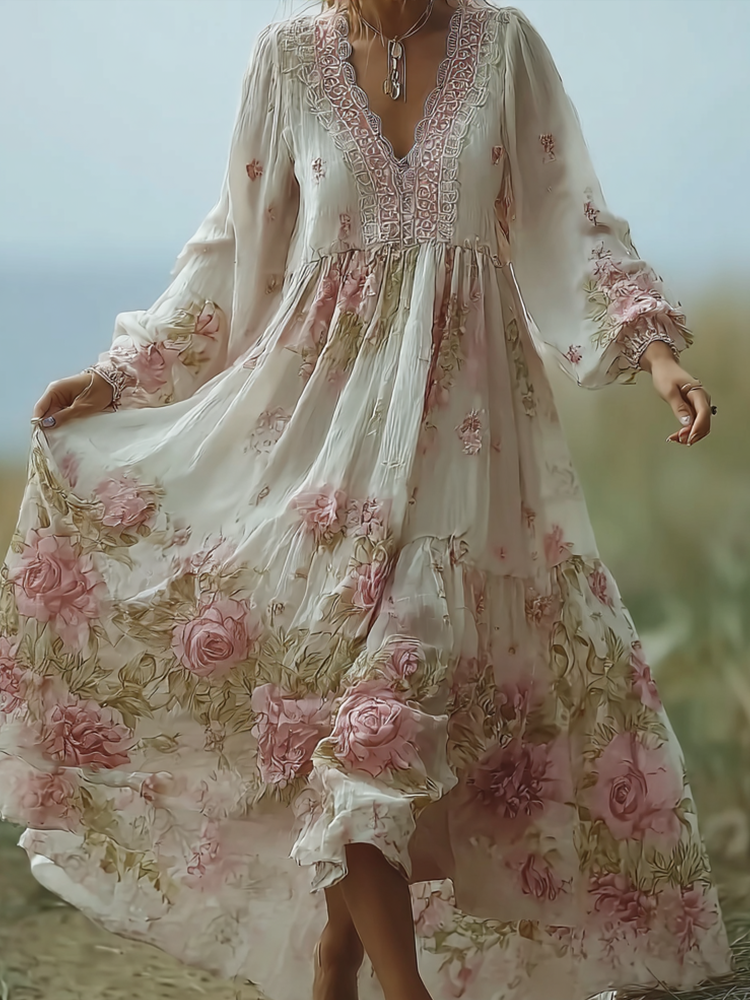 Retro Pink Rose Design V-neck Long-sleeve Casual Dress