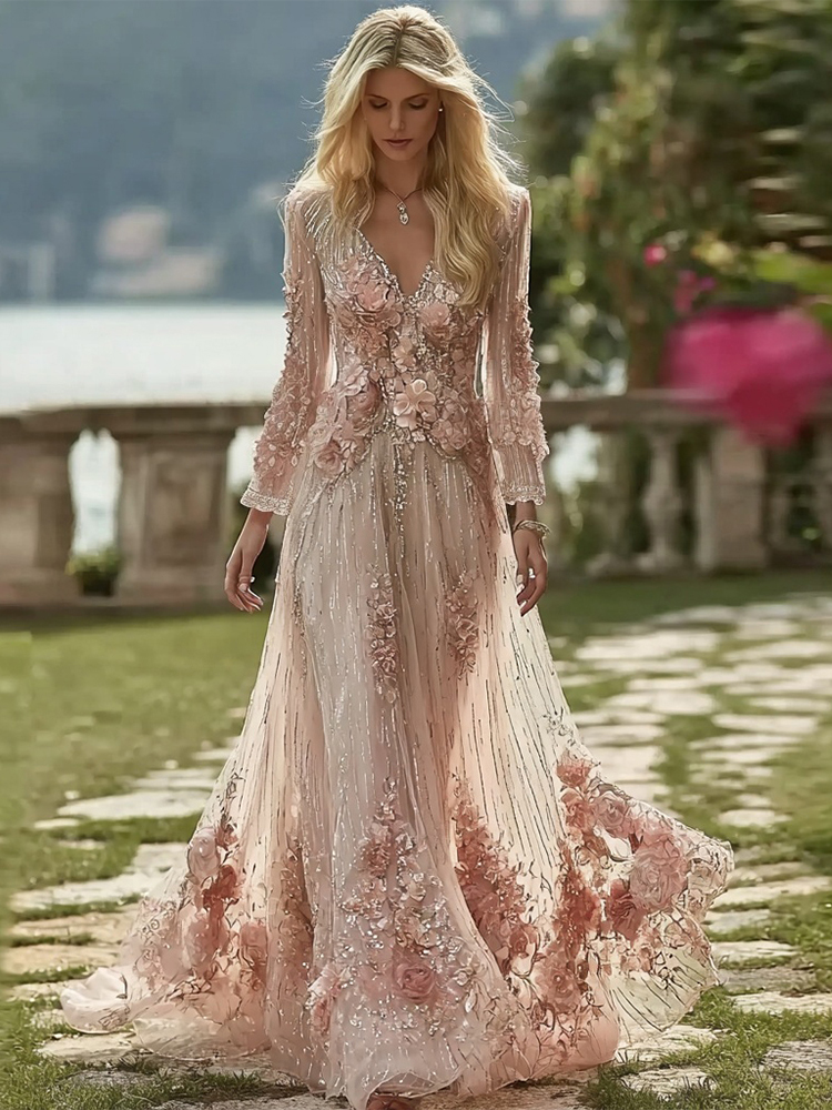 Women’s Vintage Pink Floral Embroidery Art Comfy Linen Maxi Dress