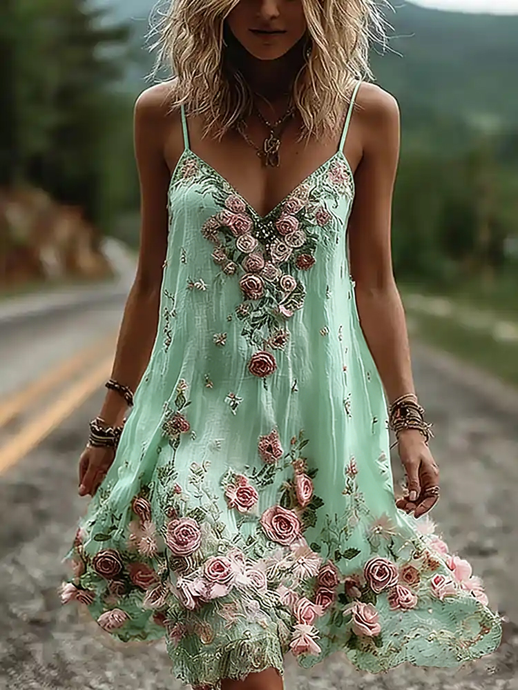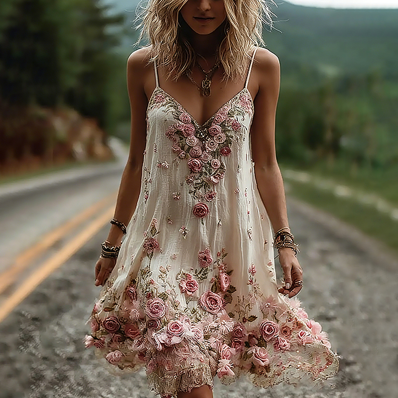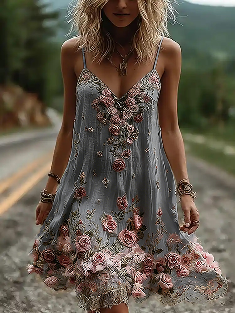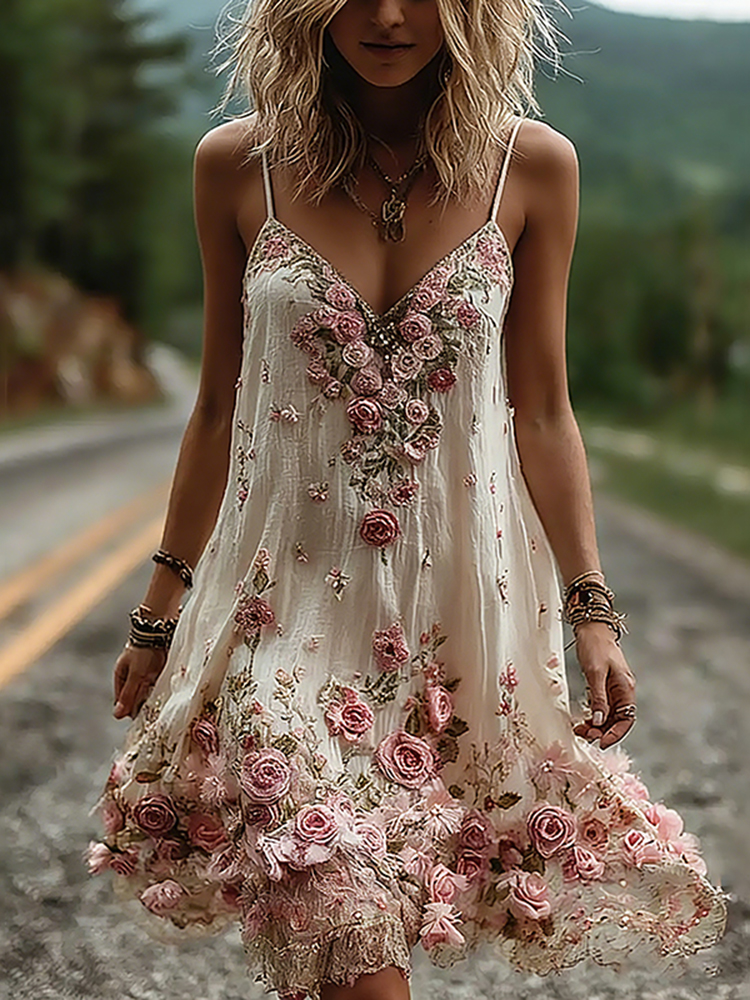 Vintage Boho Floral Embroidery Art Linen Mini Caimi Dress