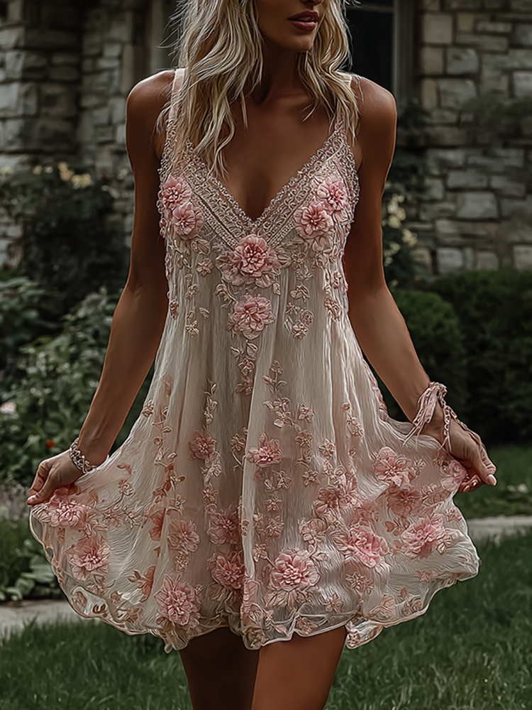Vintage Boho Pink Floral Art Cozy Linen Mini Dress