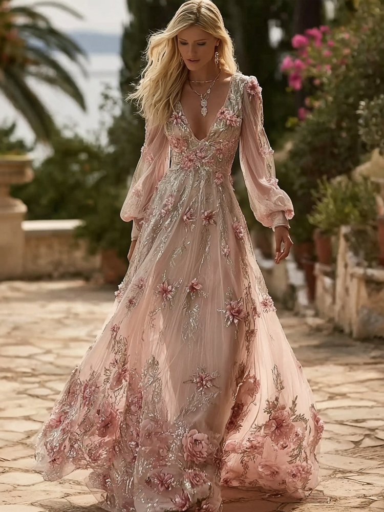 Vintage Boho Pink Floral Art V Neck Flowy Maxi Dress