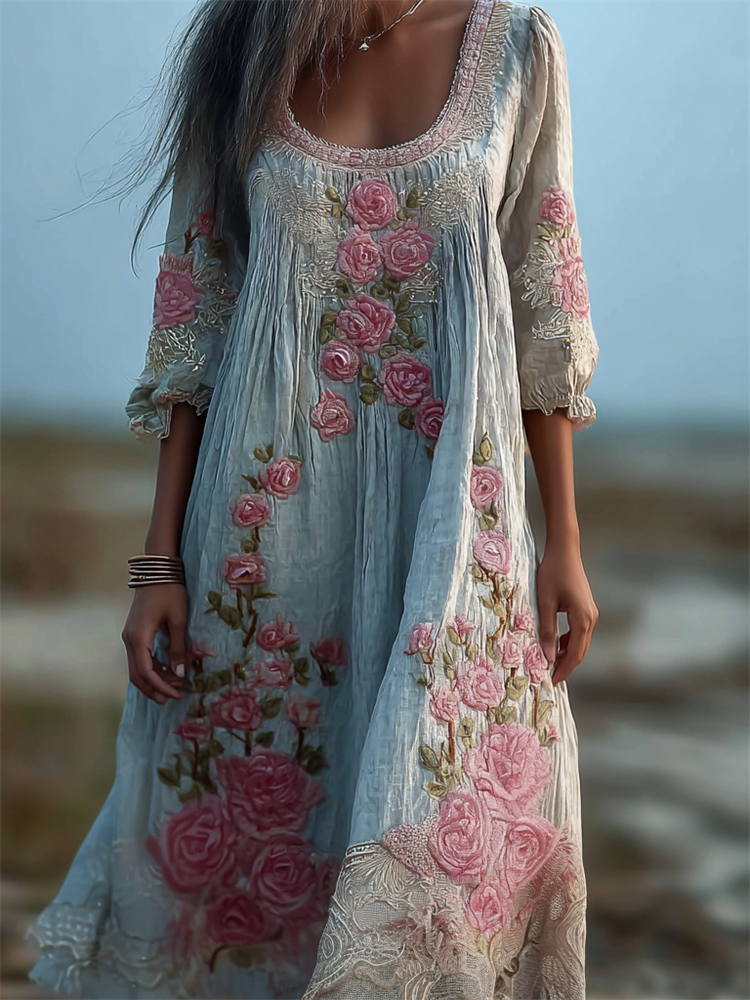 Vintage Boho Pink Roses Embroidered Lace Flowy Linen Maxi Dress