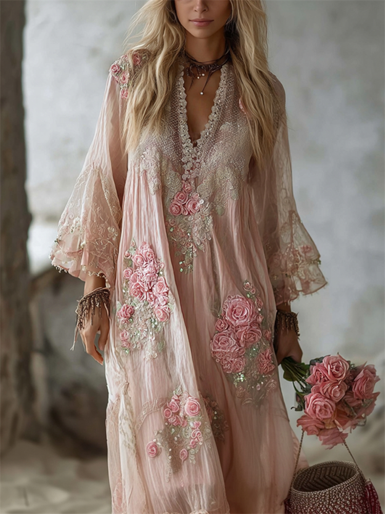 Vintage Boho Pink Roses Lace Flowy Linen Maxi Dress