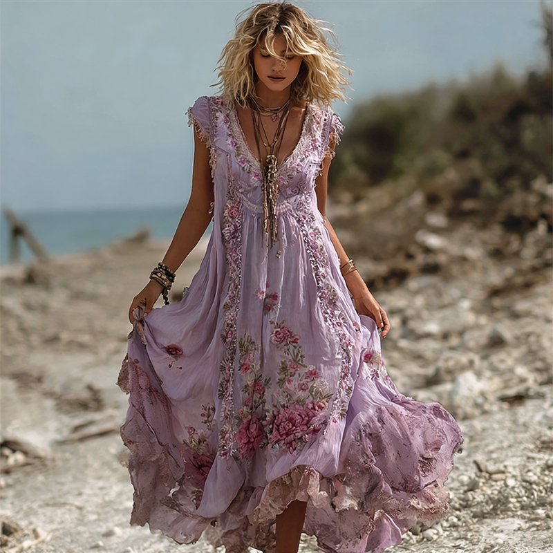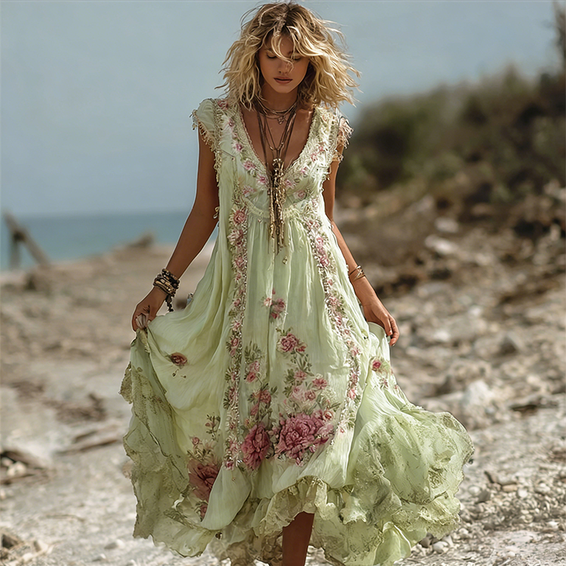 Vintage Boho Roses Embroidered Flowy Linen Maxi Dress