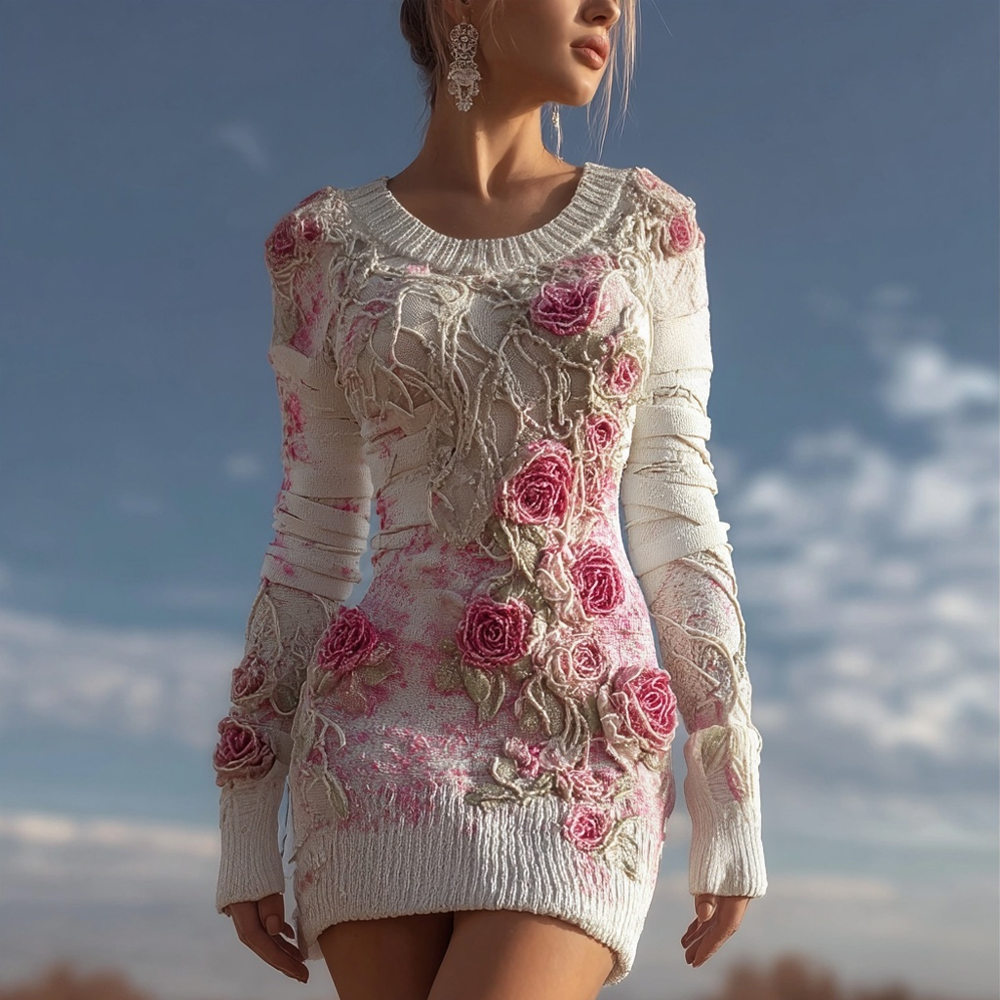 Vintage Boho Roses Fiber Art Cozy Knit Sweater Mini Dress