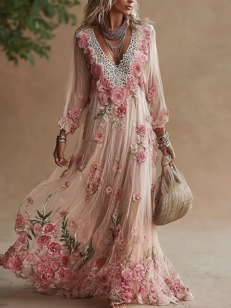 Vintage Boho Roses Lace Patchwork Flowy Linen Maxi Dress