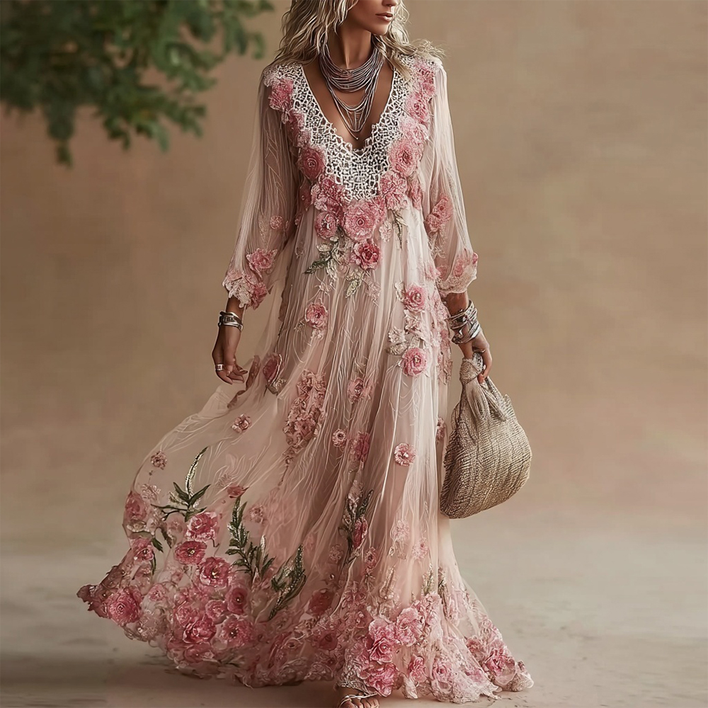 Vintage Boho Roses Embroidered Flowy Linen Maxi Dress