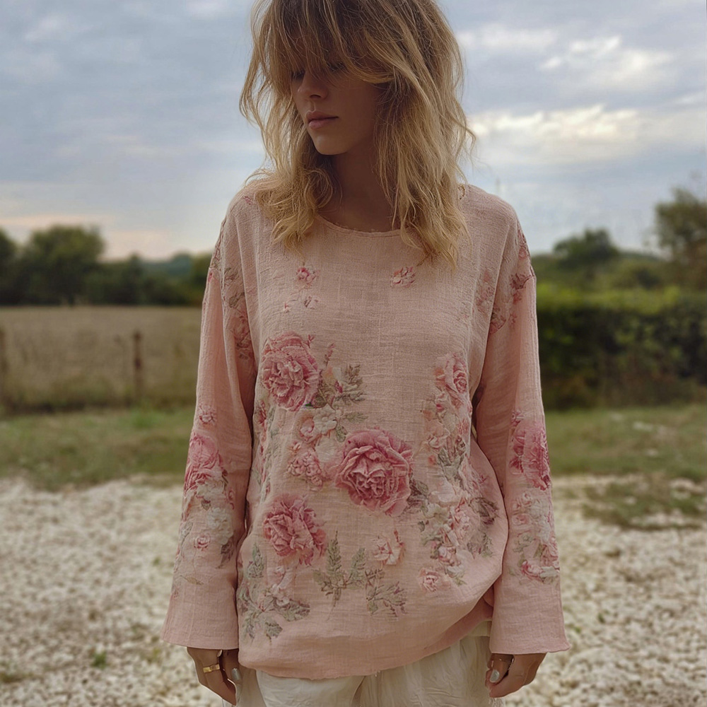 Women’s Vintage Pink Flower Embroidery Art Round Neck Long Sleeve Linen Blend T-shirt