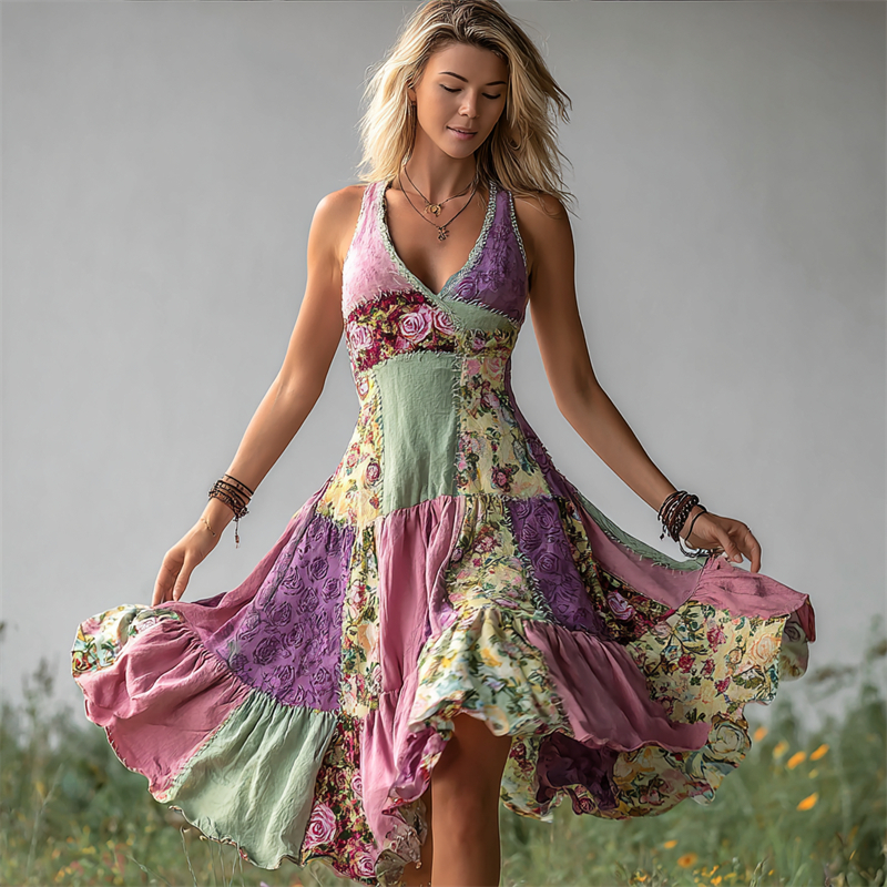 Vintage Cottage Floral Patchwork Flowy Linen Dress