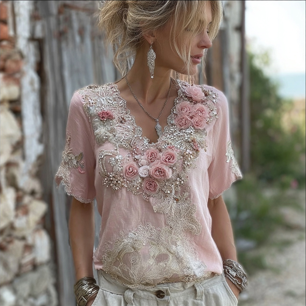 Vintage Pink Boho Floral Embroidered Flowy Linen T Shirt