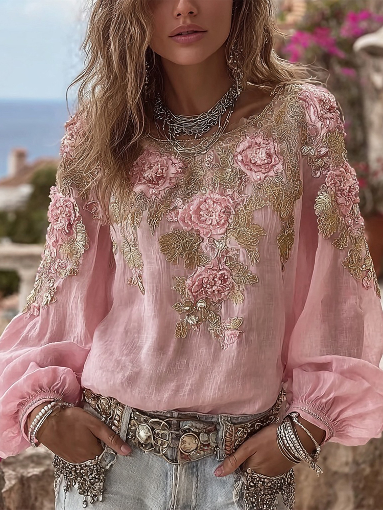 Women’s Vintage Pink Floral Embroidered Art V-neck Long Sleeve Blouse