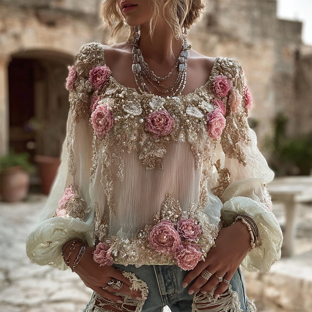Bohemian-style Pink Floral Embroidery V-neck Short-sleeved Shirt With Sequins