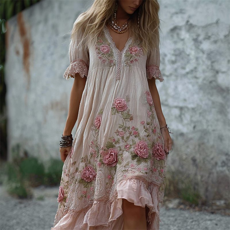 Women’s Vintage Rose Embroidery Art Comfy Linen Maxi Dress