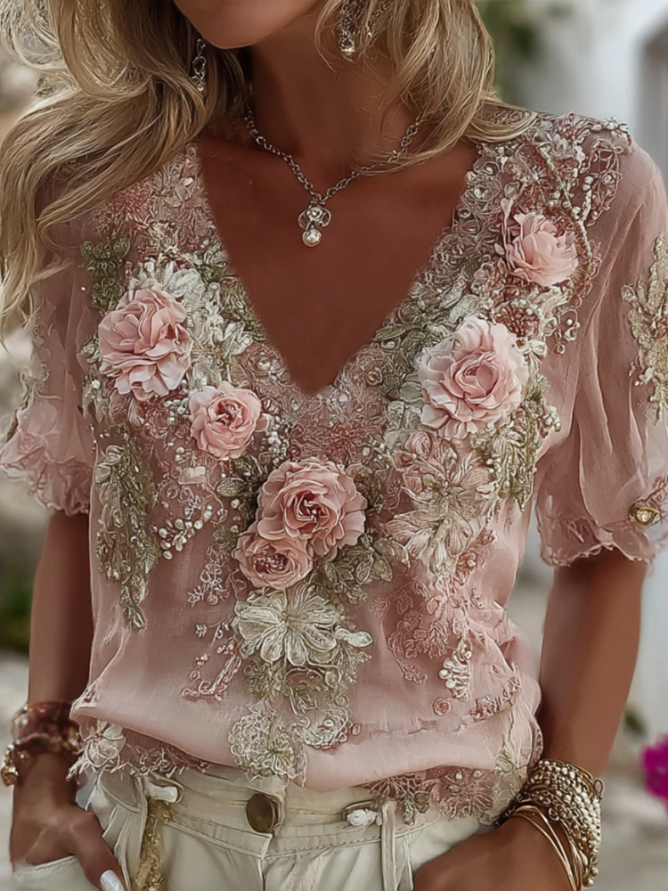 Women’s Bohemia Pink Roses Embroidered Art V-neck Short Sleeve T-shirt