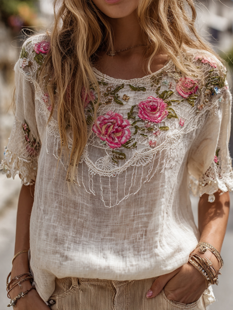 Women’s Bohemian Embroidered Rose Comfort Cotton And Linen Crew Neck Short Sleeve