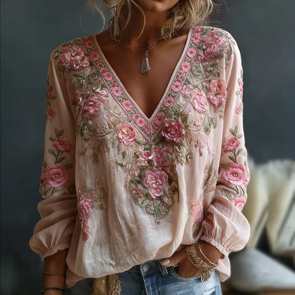 Women’s Bohemian Pink Rose Embroidery Art V-neck Long Sleeve Top