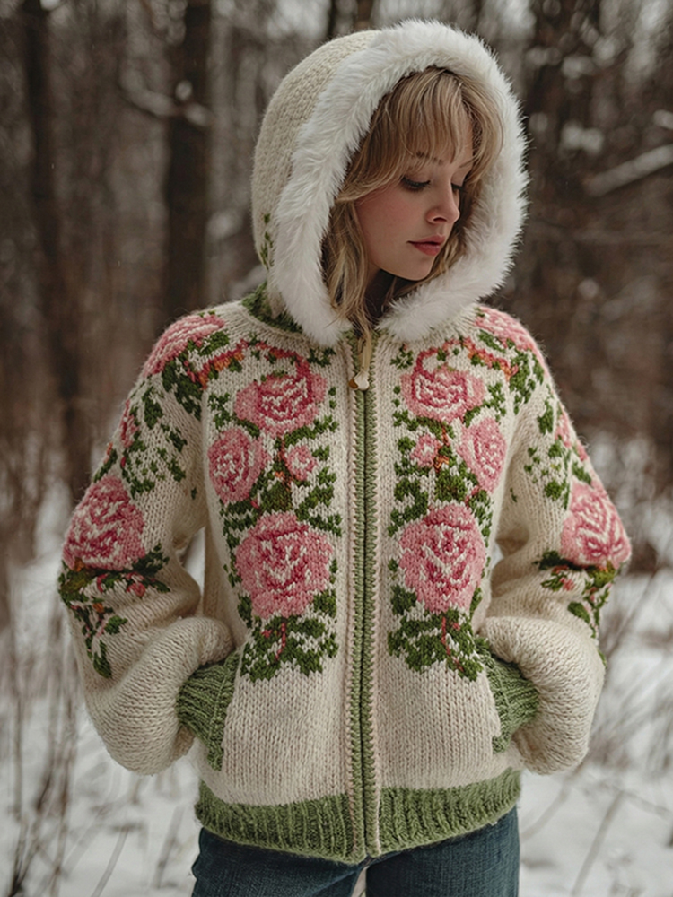Women’s Bohemian Style Pink Rose Art Cozy Fur Collar Knit Hooded Sweater Jacket