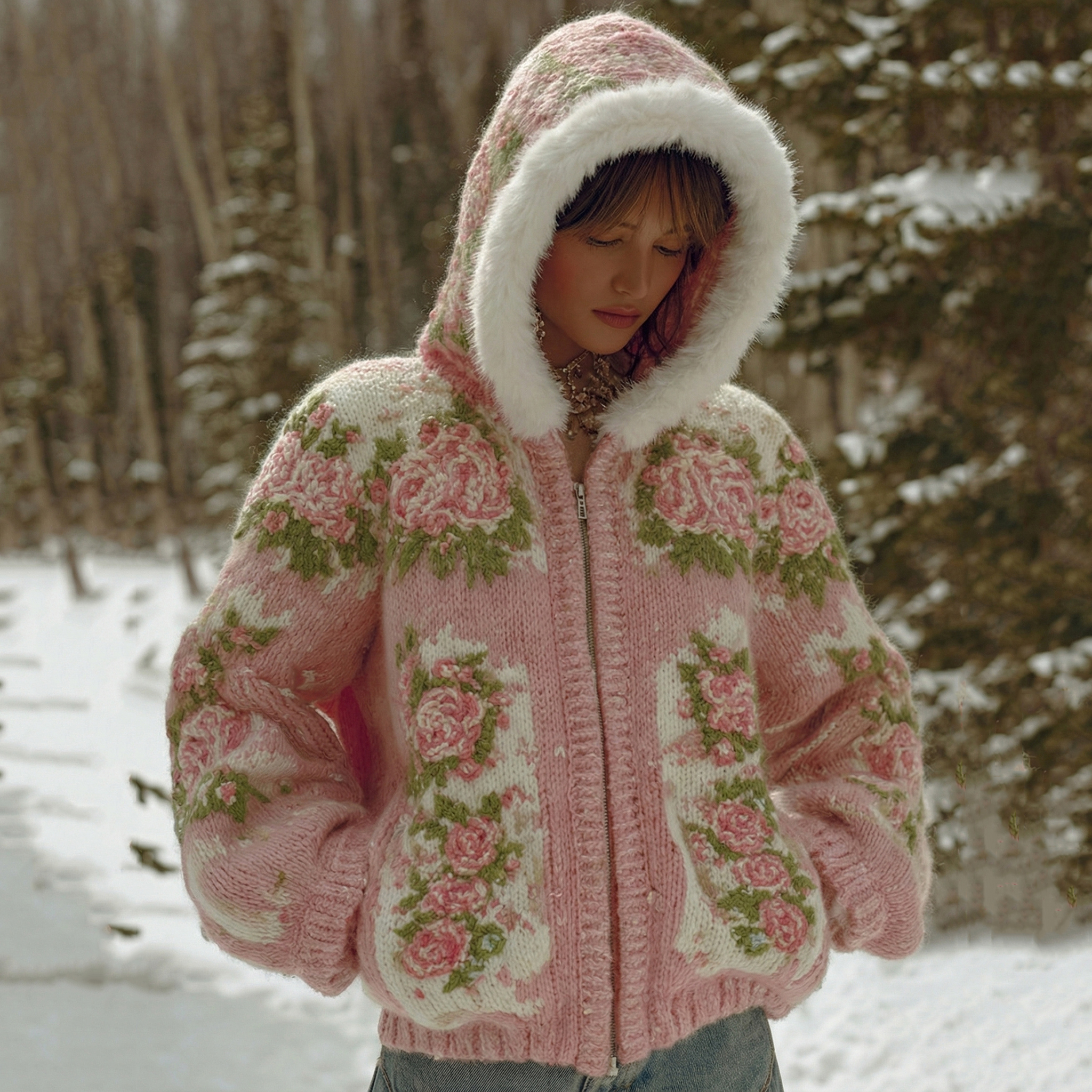 Women’s Bohemian Style Pink Rose Art Cozy Fur Collar Knit Hooded Sweater Jacket