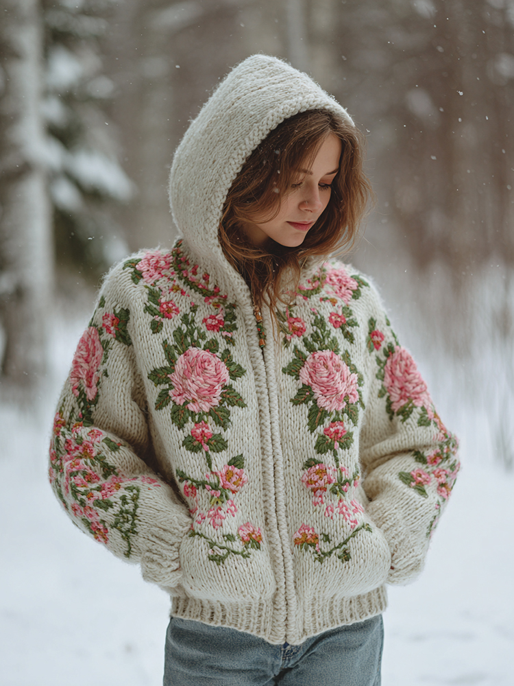 Women’s Bohemian Style Pink Rose Art Knit Zip-up Sweater