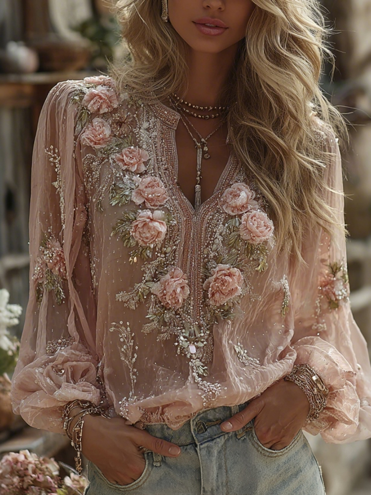 Bohemian-style Pink Floral Embroidery V-neck Short-sleeved Shirt With Sequins