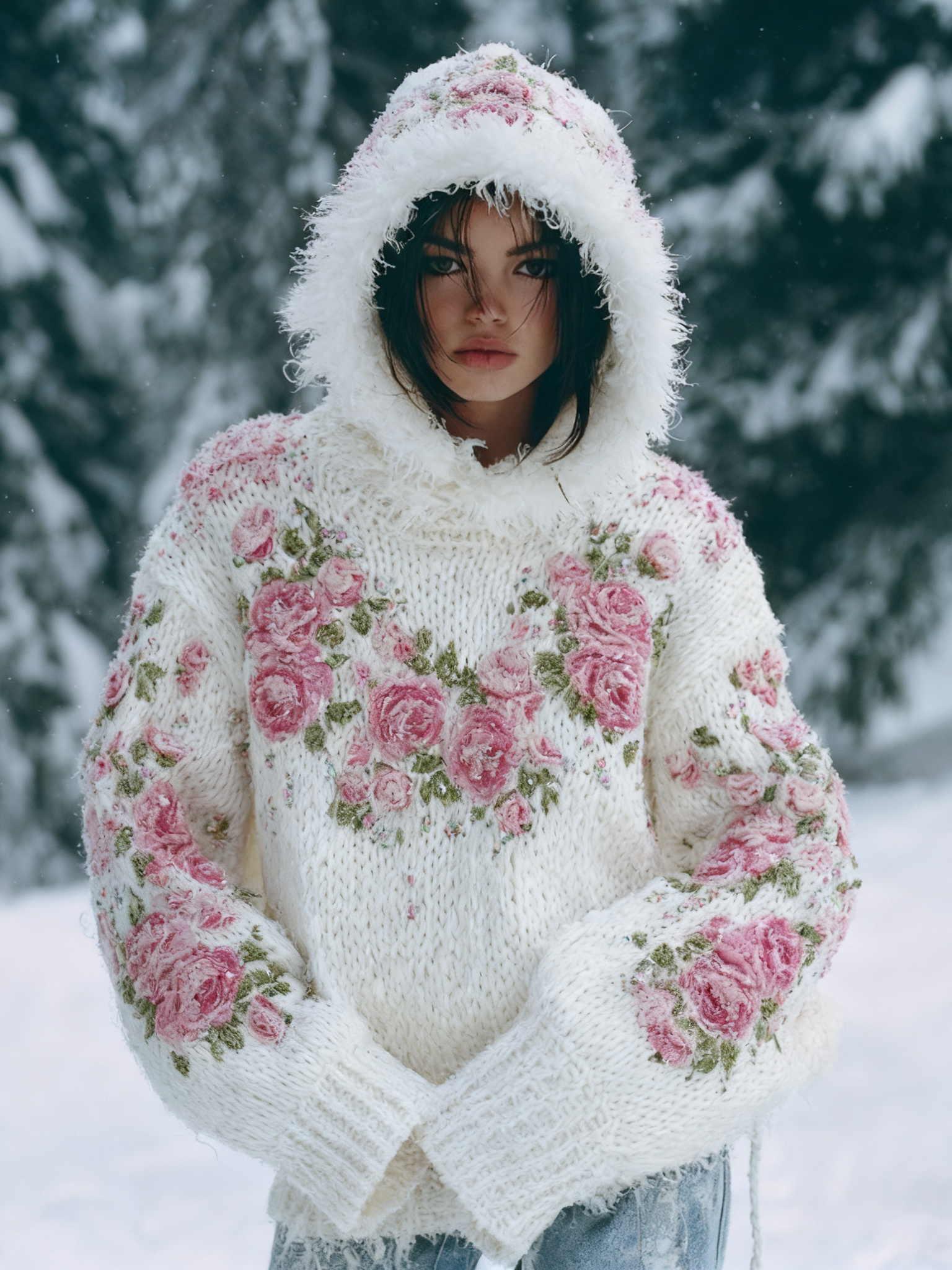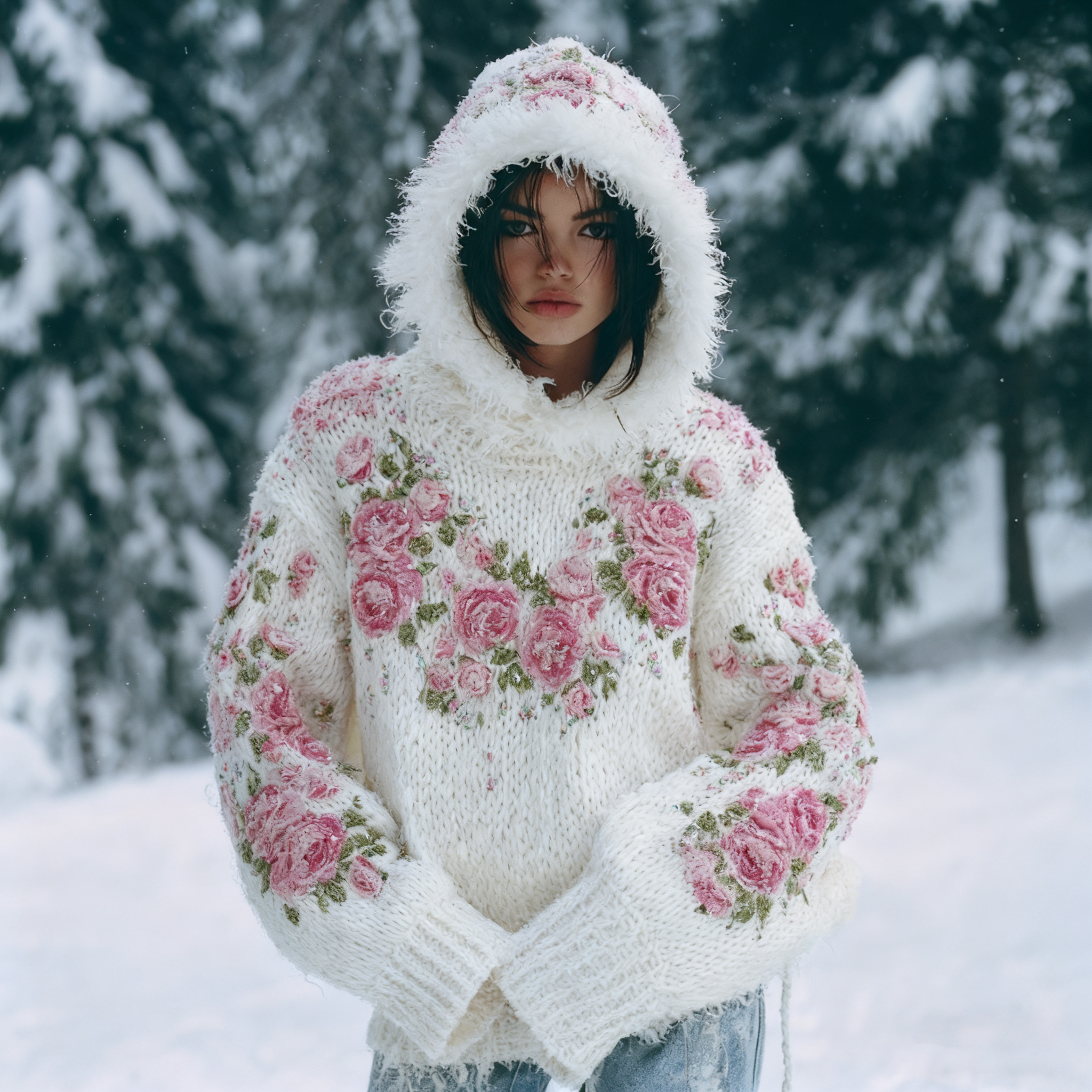 Women’s Bohemian Style Pink Rose Art Warm Hooded Knitted Sweater