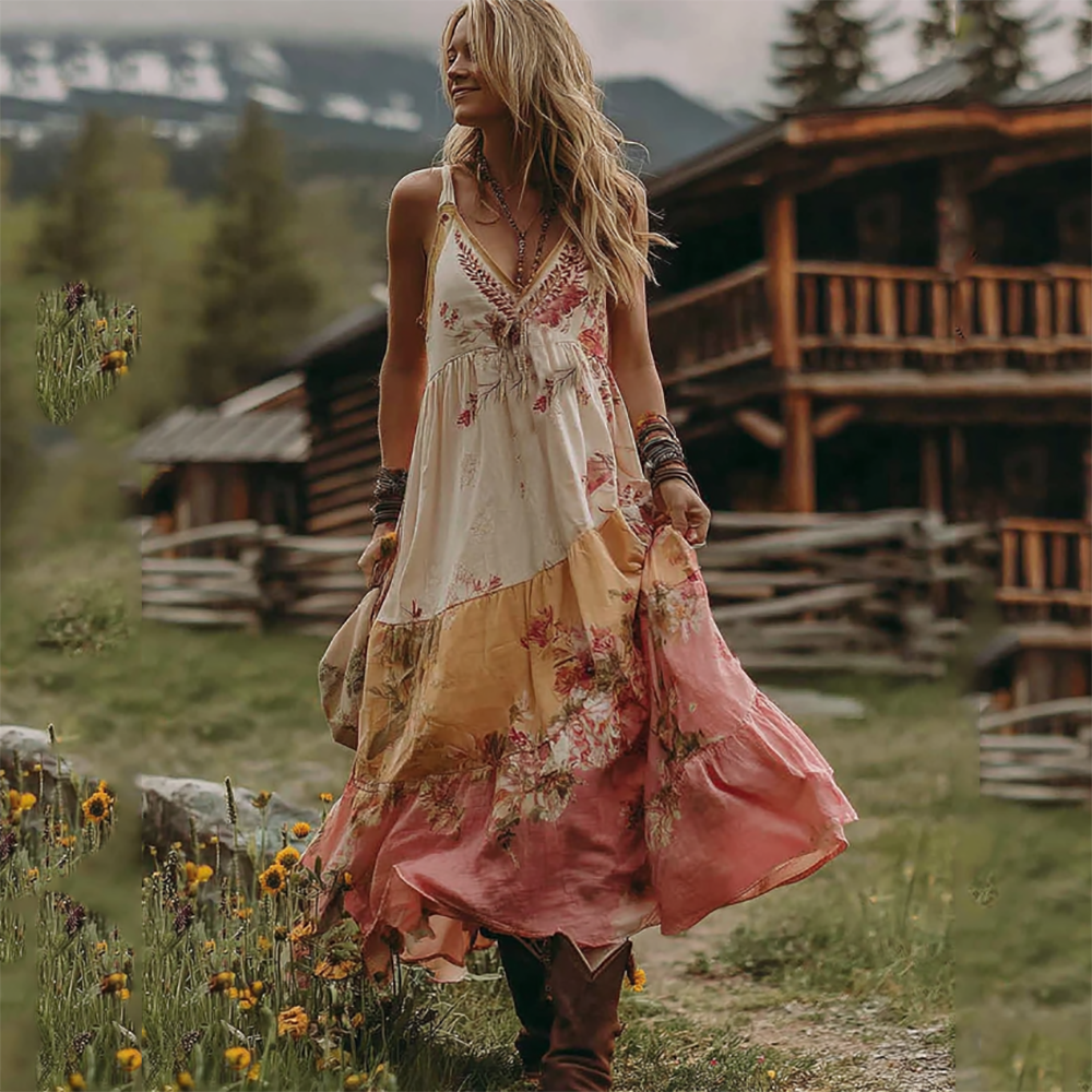 Women’s Boho Floral Art V Neck Comfy Sleeveless Maxi Dress