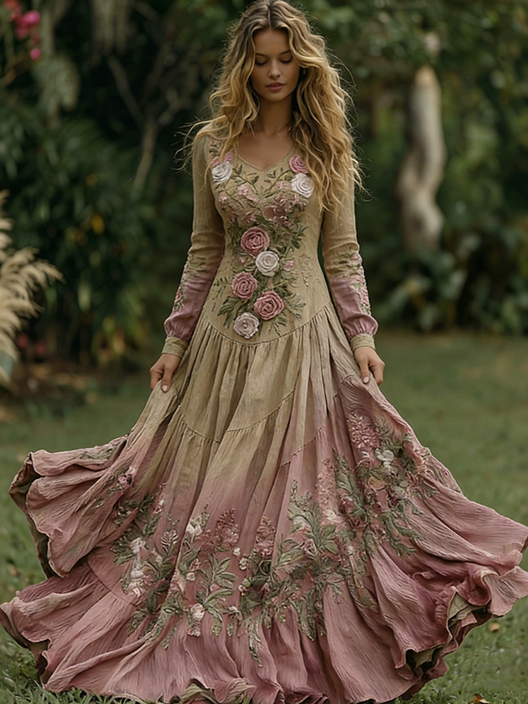 Women’s Vintage Rose Embroidery Art Comfy Linen Maxi Dress