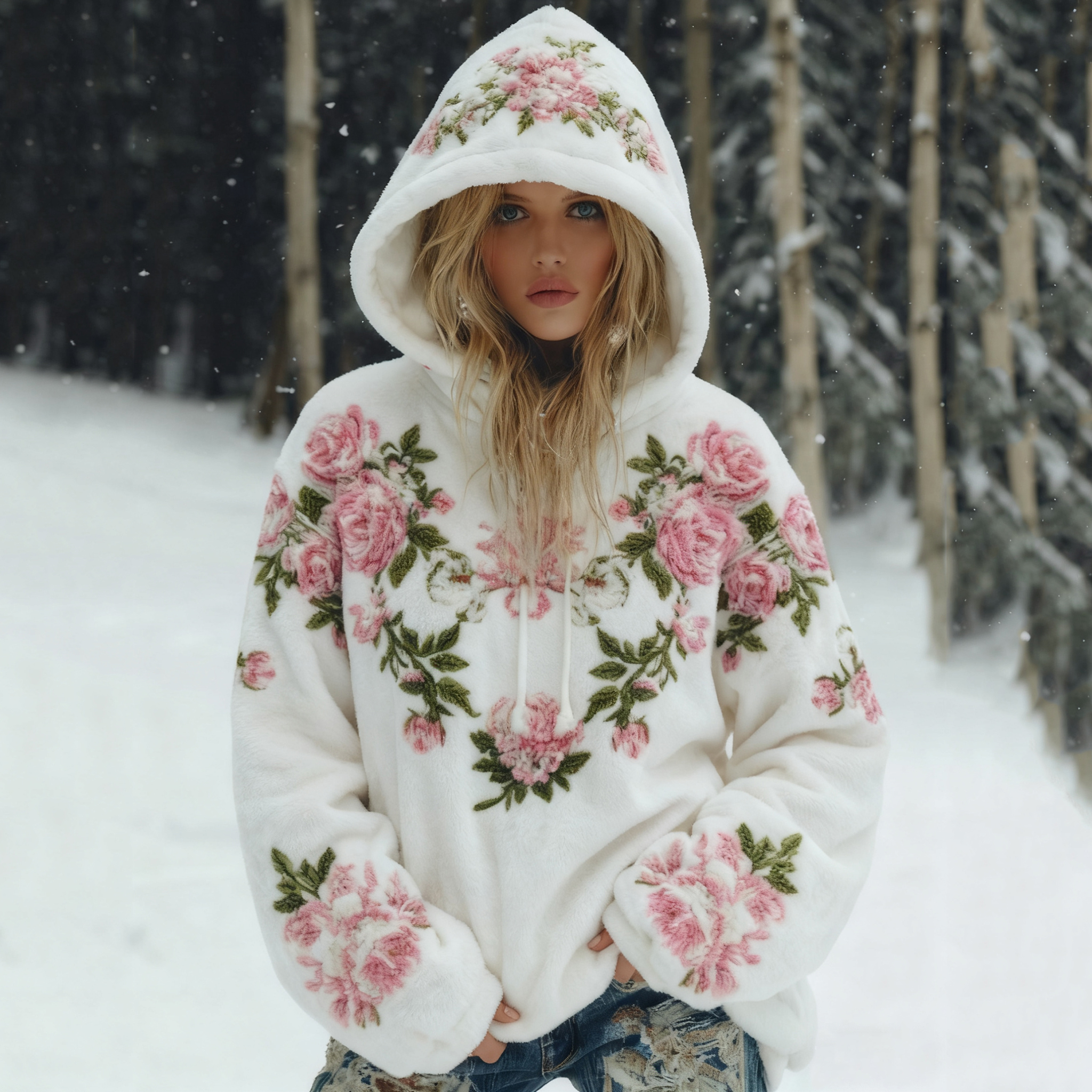 Women’s Boho Pink Rose Floral Art Flannel Hooded Sweatshirt